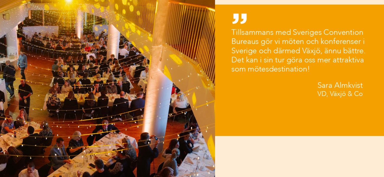 Som Convention Bureau fortsätter Växjö & Co att värva möten till Växjö och att stötta arrangören. Genom det nationella nätverket får vi ytterligare kunskap och verktyg som kan bidra till ännu mer professionella konferenser. Det kan i sin tur göra Växjö till en ännu mer attraktiv plats för möten och konferenser!